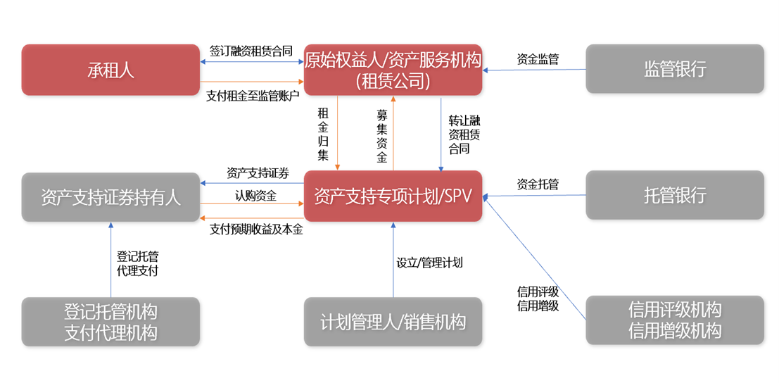 第二种是租赁资产证券化,即租赁公司将持有的未来有稳定的现金收入的租赁资产组成一个资产池,然后将构成此资产池的全部“债权”转让给特殊目的公司(SPV),由SPV以预期的租赁债权为保证,经过担保机构的担保增信措施和评级机构的信用评级,发行资产支持债券出售给投资者。具体法律关系及资金流向图如下: