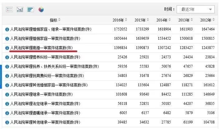 根据国家统计局数据,2012年经法院一审审结的离婚案件为124.38万件,2013年到2016年逐步走高,2017年的司法数据报告更是已突破140万大关。(见下图,数据来源:国家统计局官网)