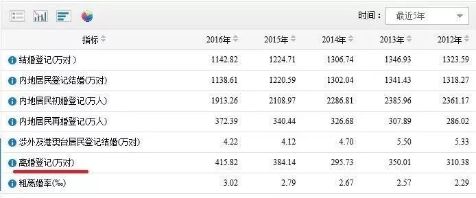 此外,结合民政局的离婚数据(见下图,2016年度全国离婚登记为415.82万对,2017年的数据尚未出炉)