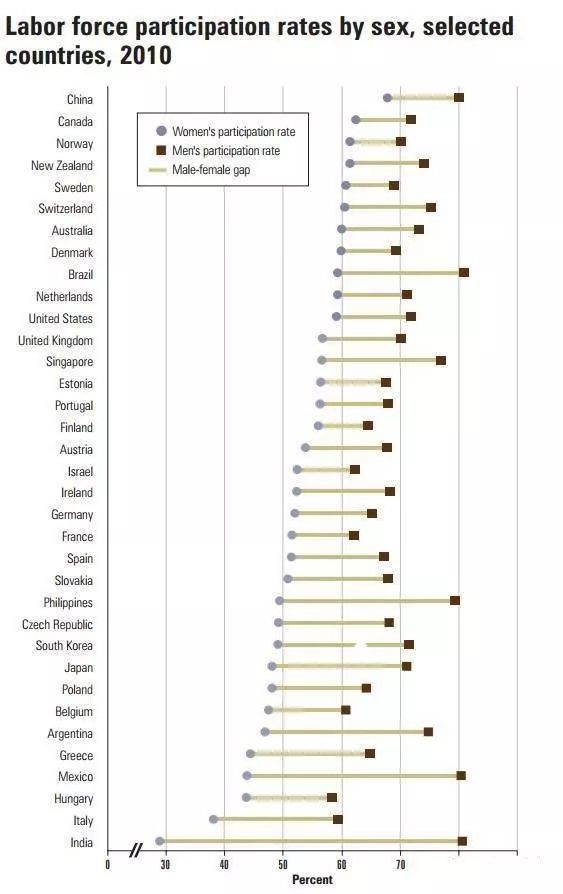 在中国有句鼓舞了几代女性的话:“妇女能顶半边天”,其实中国妇女顶起的天空面积远超世界平均水平,甚至超越发达英美国家。去年有一张很火的美国国家统计局网站对各国劳动参与率的统计图表显示,2010年时中国妇女的劳动参与率已经接近70%,而英美发达国家中妇女劳动参与率最高的加拿大也只不过是60%出头,美国和英国更是连60%都不到。(见下图)