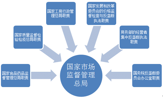 2018年3月17日,十三届全国人大一次会议表决通过关于国务院机构改革方案的决定。改革后国务院正部级机构减少8个,副部级机构减少7个,除国务院办公厅外,国务院设置组成部门26个。其中,对于市场监管机构做出了较大幅度的调整,合并国家工商行政管理总局、国家质量监督检验检疫总局以及国家食品药品监督管理总局,组建新的国家市场监督管理总局。同时,原来国家发展和改革委员会的价格监督检查与反垄断执法职责,商务部的经营者集中反垄断执法以及国务院反垄断委员会办公室等职责也由新的国家市场监督管理总局负责。此外,考虑到药品监管的特殊性,组建国家药品监督管理局,由国家市场监督管理总局一并管理。