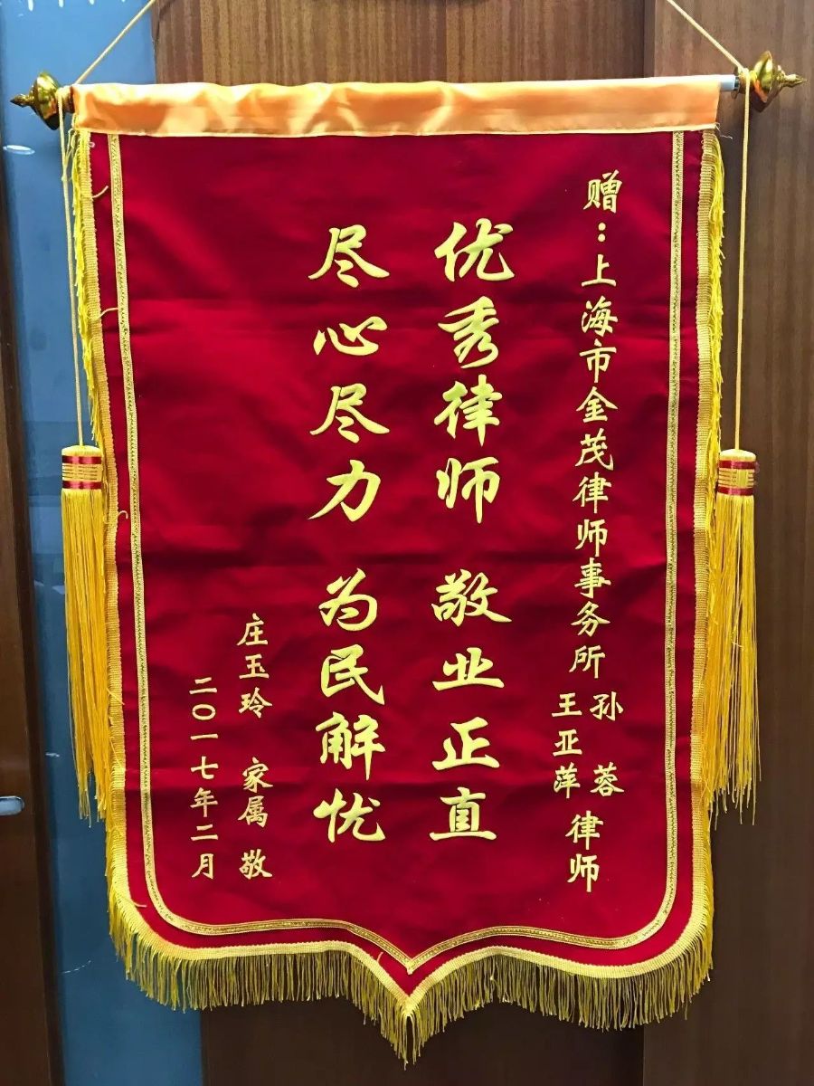 现在案件已告一段落,收到法院调解书后,庄女士表示终于可以安心的睡个好觉了。为了表达对承办律师的感谢,表扬他们的辛勤付出和周到细致的法律服务,庄女士委托儿子、儿媳将一面写有“优秀律师,敬业正直;尽心尽力,为民解忧”字样的锦旗赠予本所孙蓉律师和王亚萍律师表示感谢。在此,我们也提请所有的朋友,关注自己的权利,保护自己的权利,不要让权利随着时间的流逝而灭失。