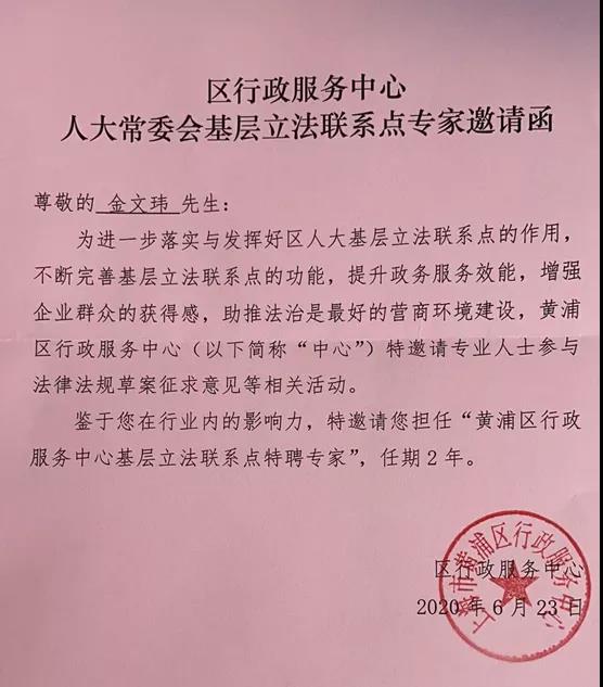 近日,本所合伙人金文玮律师受邀担任上海市黄浦区行政服务中心基层立法联系点特聘专家。
